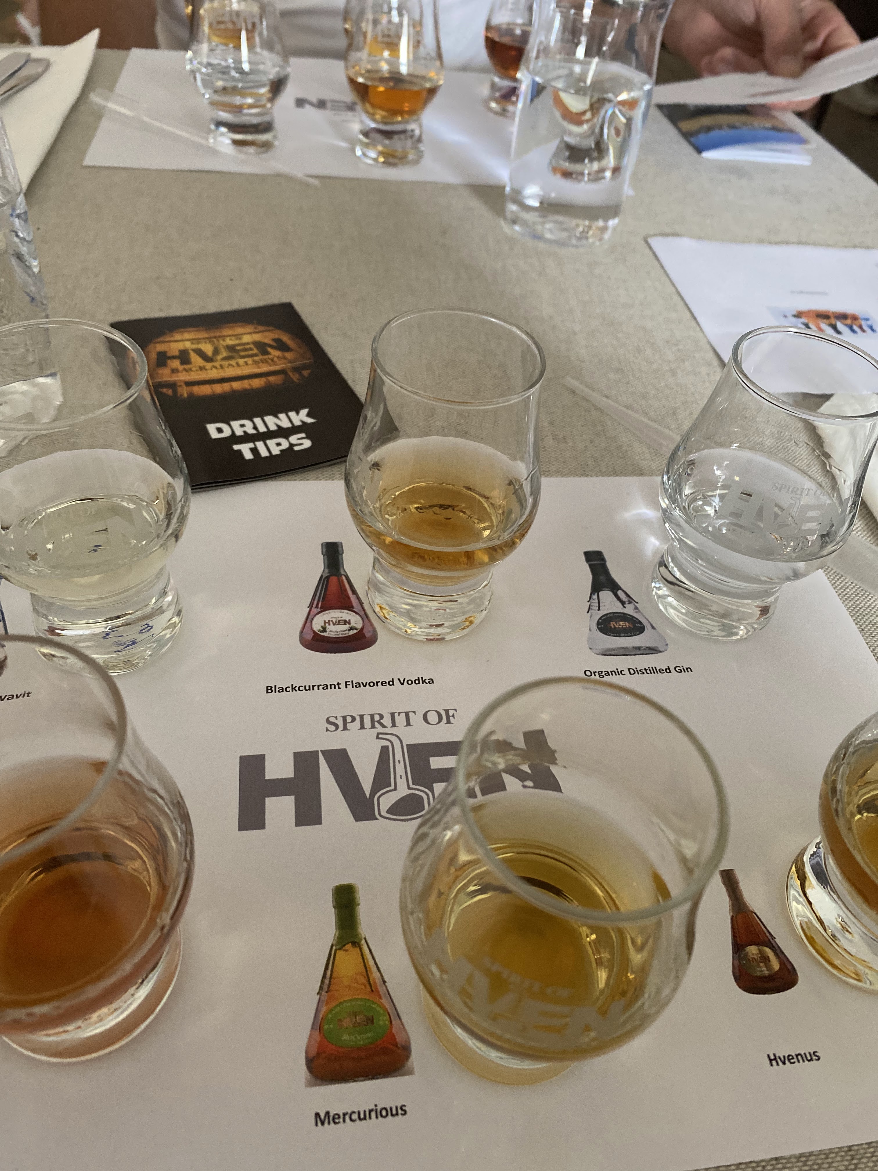 När vi bokade oss på campingen upptäckte vi att det skulle vara spritprovning i en av byns restauranger. Spirit of Hven var på besök och vi fick vara med på en trevlig provning av både Gin, Whiskey, Slånbärslikör och Svartvinbärsvodka. Lite goda tillbehör att tugga på medan vi fick höra om destilleriets historia.