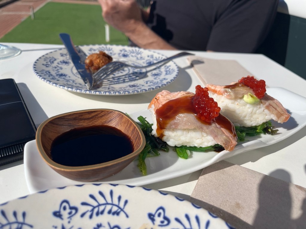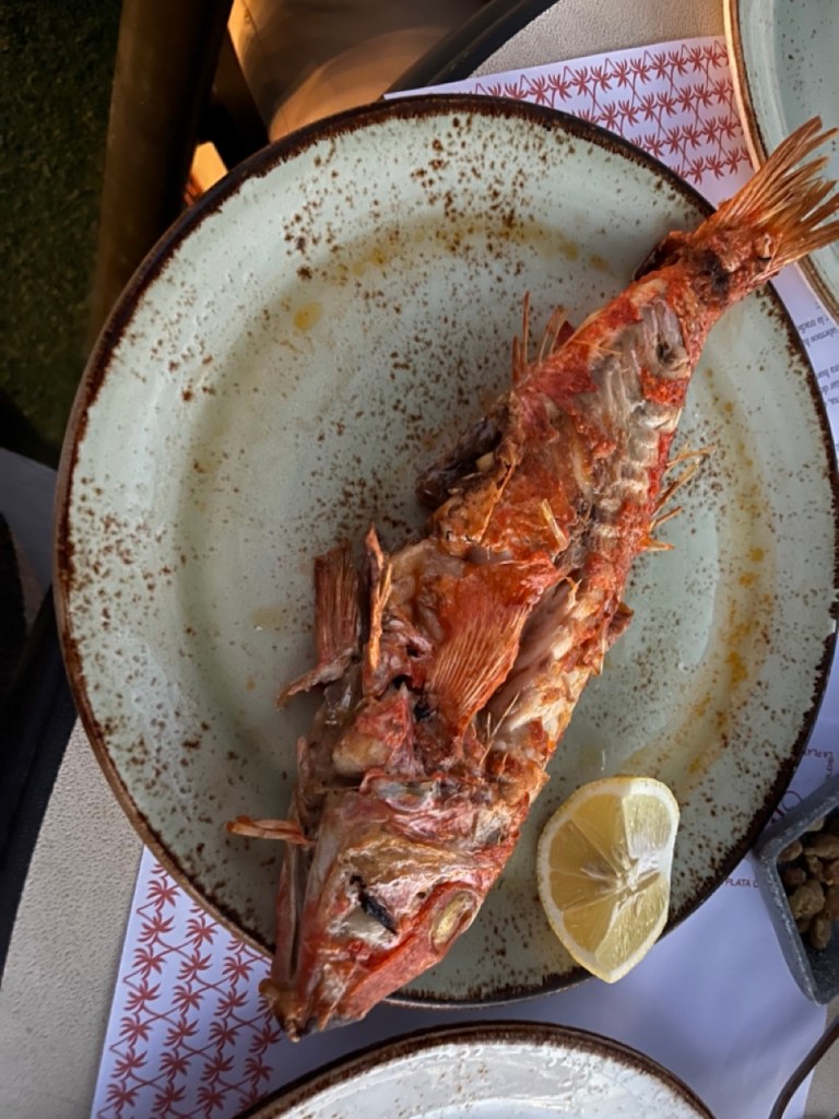 Efter Nerja åkte vi till Baviera GC och njöt av en runda golf på en bana som var helt ok men med väldigt torra fairways . Det gäller att ha ren bollträff för att få ett schysst slag. Inte blev det någon dusch på golfbanan heller pga vattenrestriktionerna. Men med full vattentank i husbilen så funkade det alldeles utmärkt att duscha i den. Vi hittade ingen ledig ställplats för natten så vi ställde oss några mil innan Malaga längs med stranden där vi hittade en mysig restaurang och fick njuta av dagens fångt – en salmonetes (red mullet).