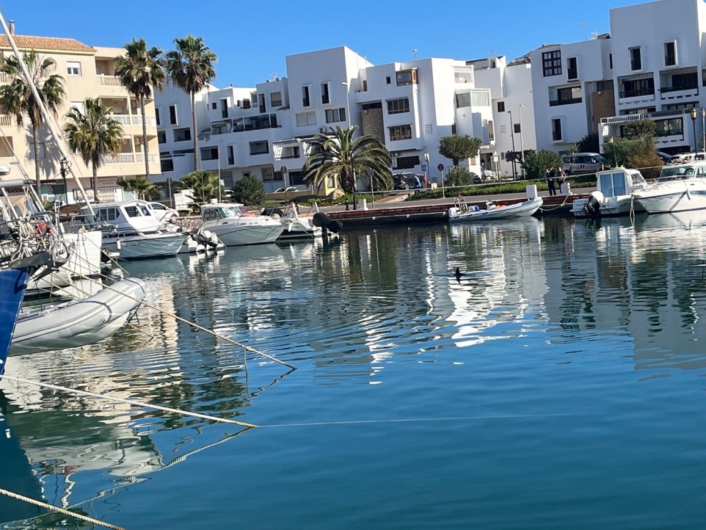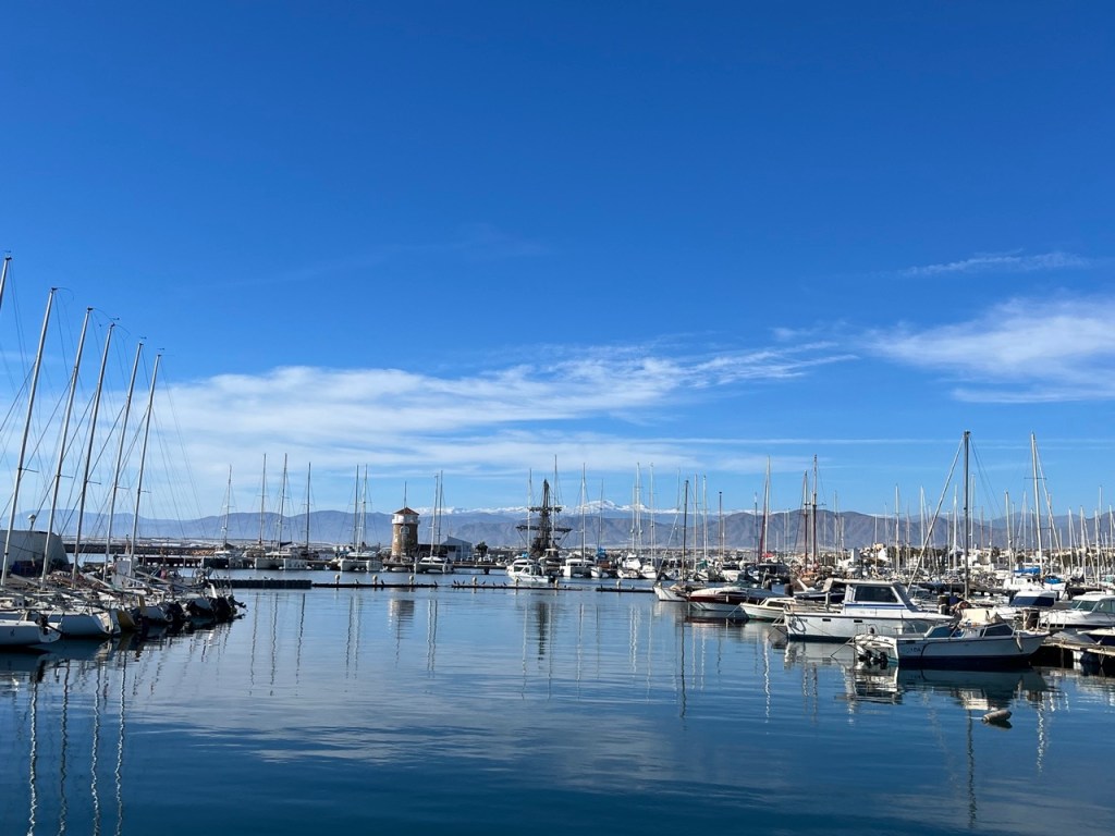 Efter några blåsiga och regniga dagar är solen tillbaka med full kraft. Idag har vi njutit av en blå himmel och 21 grader. Vi kom till Almerimar i förrgår. Skulle egentligen bara köra inom och kolla golfbanan men vi blev förtjusta och fick en ställplats i hamnen. Almerimar är charmigt med småbåtshamnar som går in som vikar genom stan. Fler mysiga restauranger och pubar och inte minst en trevlig golfbana som vi spelade igår. Greenerna håller inte toppklass men det är en trevlig bana med 27 hål. De skiftar slingor dagligen så i morgon ska vi spela en annan kombo. Dessutom gäller GolfAmore så vi betalar halv greenfee. Här är gott om svenskar. Golf Plaisir har resor hit så vi träffade många landsmän både på banan och på stan i går kväll. Ovanför staden skymtar man snöklädda toppar i Sierra Nevada.