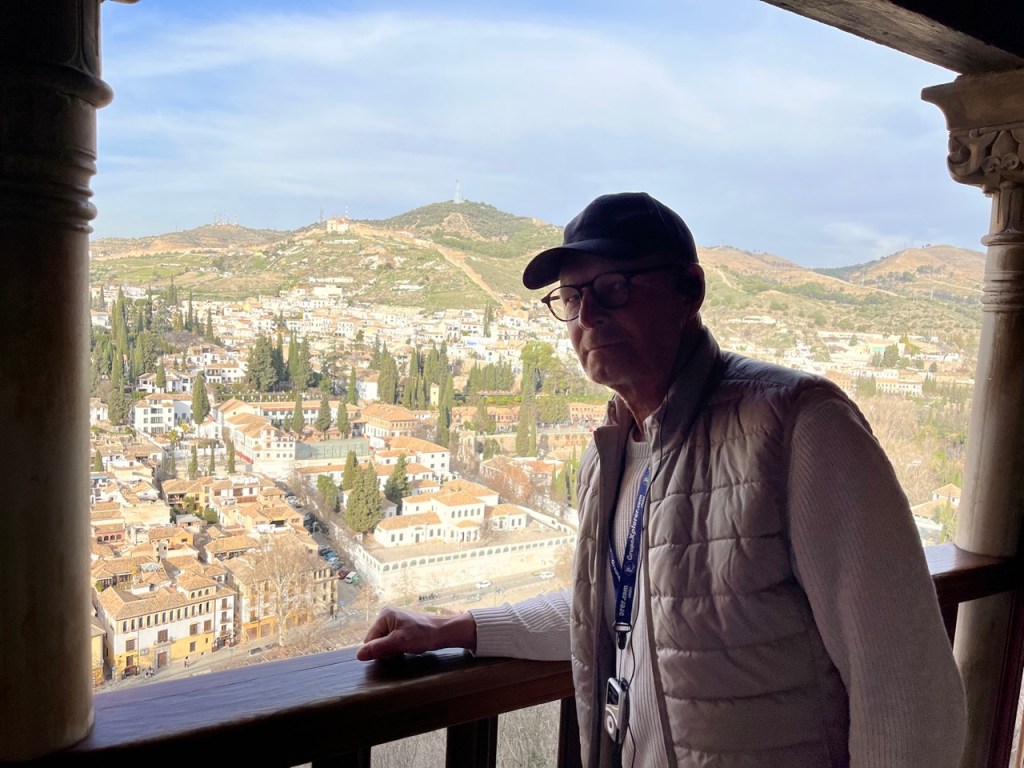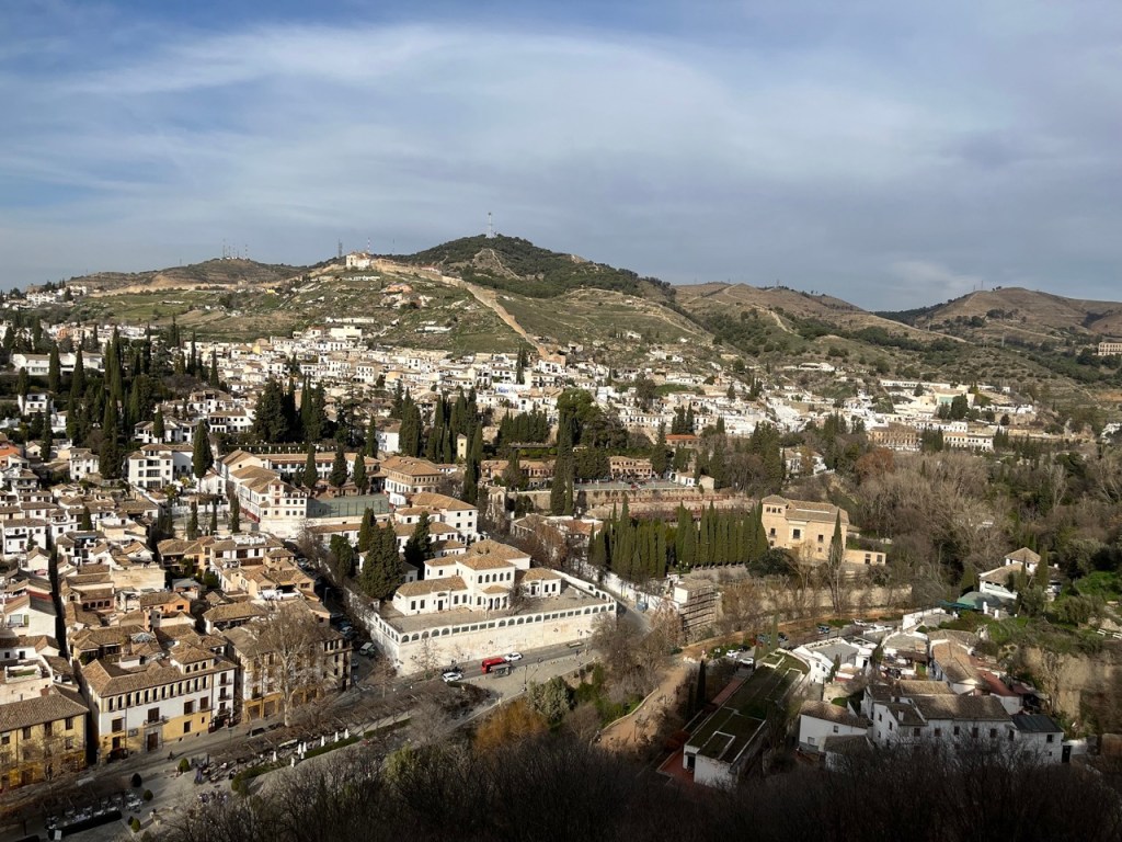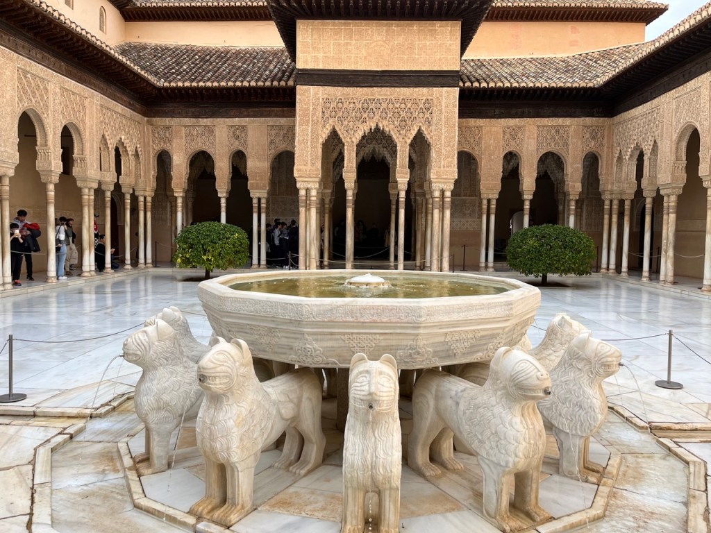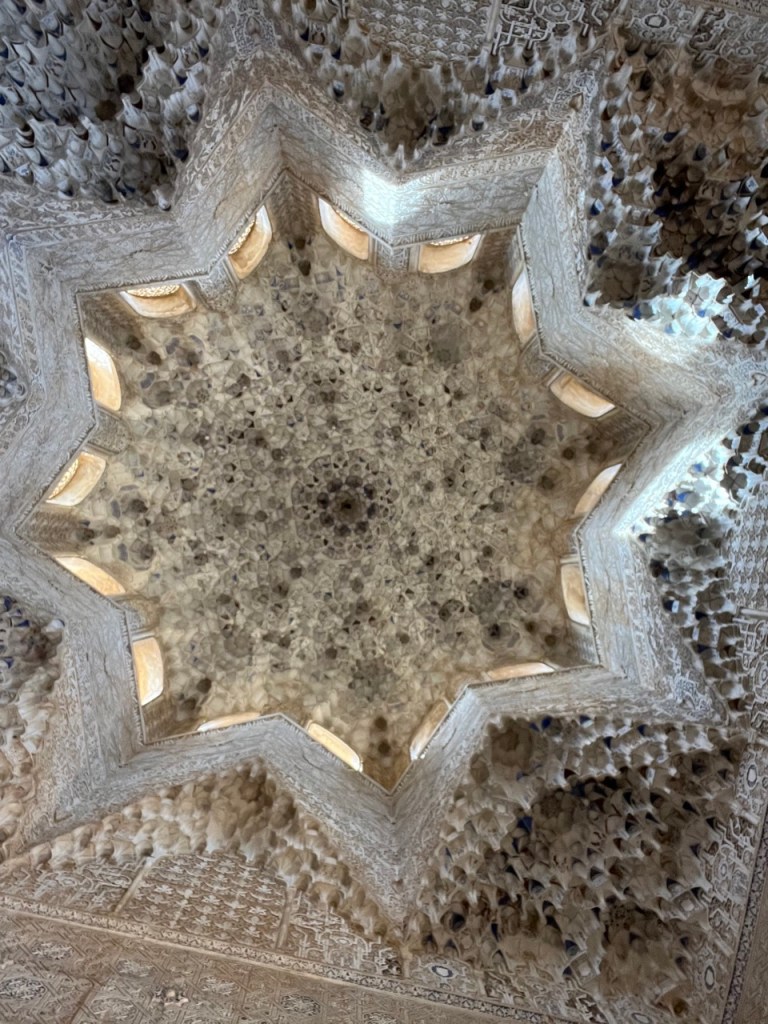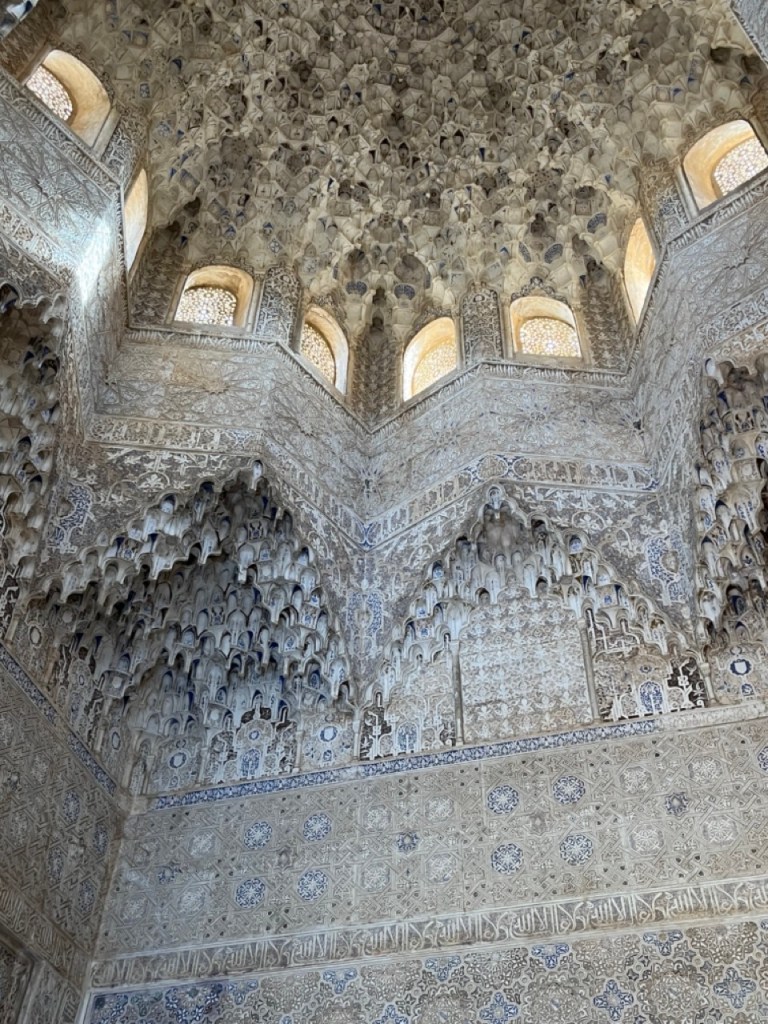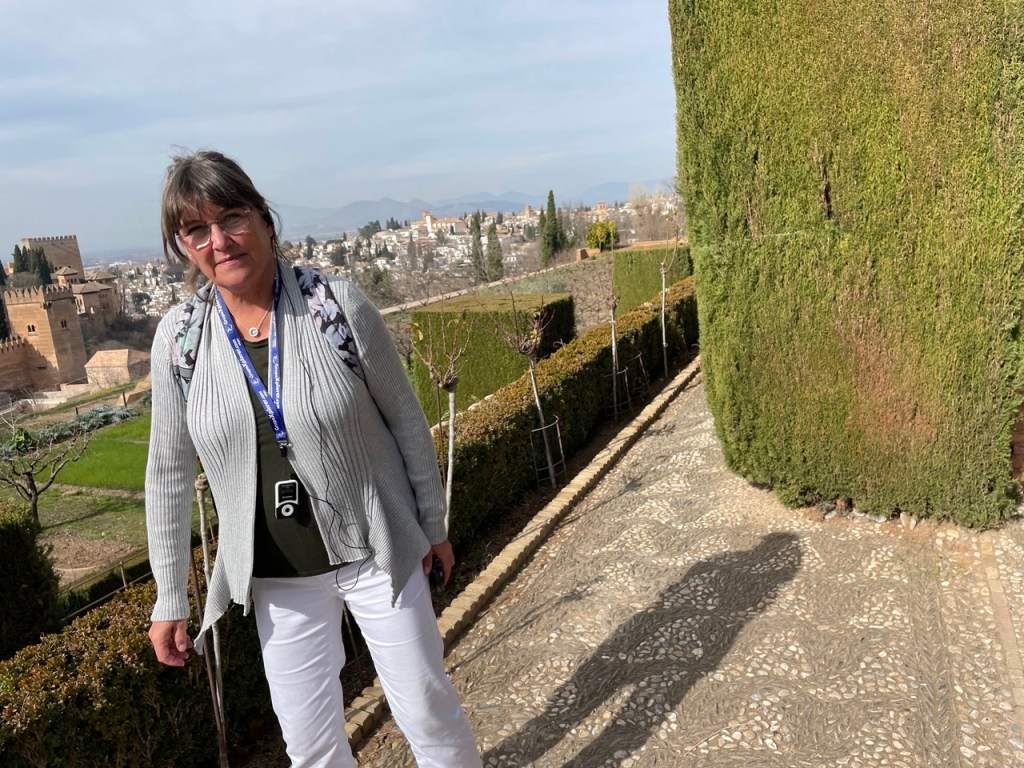 Vi bokade igår biljetter till Alhambra. Det är ju ett måste nu när vi är i Granada. Det blev en guidad tur på nästan 4 timmar. Det är en yta som motsvarar 40 fotbollsplaner så det är lite att gå igenom. Dessutom tog guiden allt snack på först spanska och sen engelska så liiite segt blev det men, wow – vilket imponerande byggnadsverk. Här bodde sultaner med sina fruar och konkubiner med en hel flock ungar. Man kan bara föreställa sig hur de njöt av lyx och flärd. Det är helt galet mycket detaljer i marmor och andra stenutsmyckningar, tak i trä, magiskt snidade trädörrar mm. Palatsen som en gång byggdes av moriska folk under Nasride-dynastin har därefter olika historer med rivningar, tillbyggnader och nybyggnader. Här finns mer att läsa om kulturminnet Alhambra. Uppe i högsta tornet har man också en fin utsikt över Sierra Nevada snötäckta toppar. Helt klart är Alhambra värt ett besök. I kväll lär vi somna gott efter en lång dag med fler steg än efter en 18-håls golfrunda.