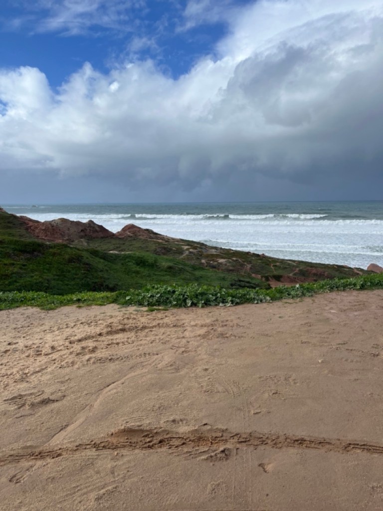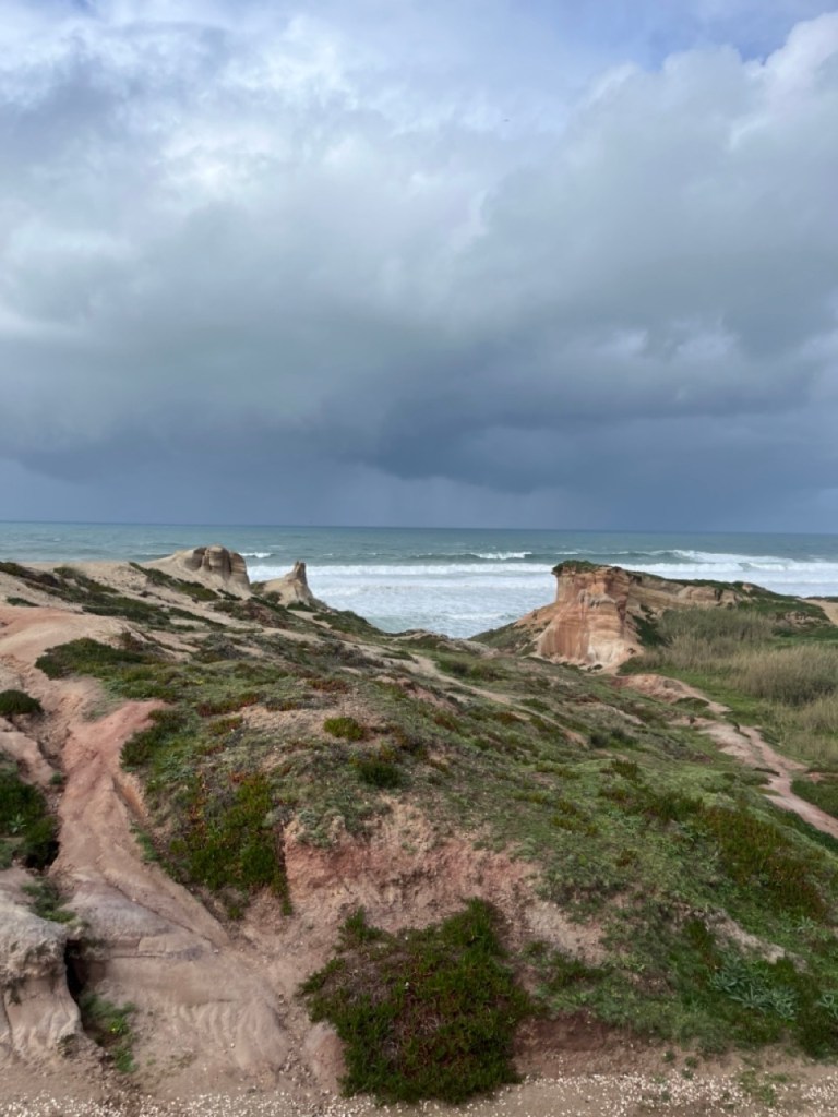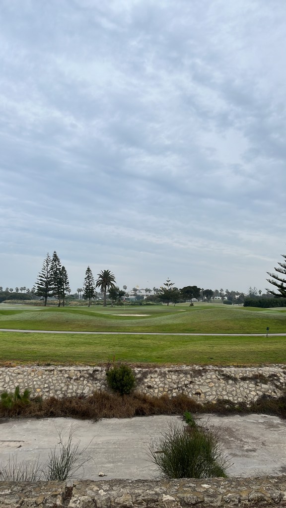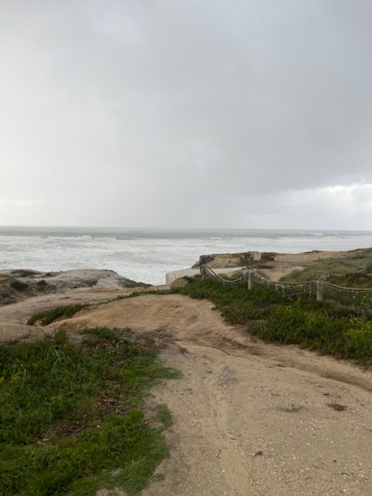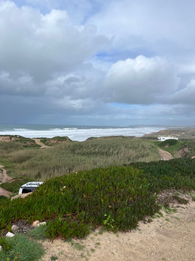 Vi passerar nu gränsen till Portugal och åker på en av Europas längsta broar, Vasco da Gama-bron. Planen var att stanna vid fina golfbanan Praia D’el Rey, norr om Lissabon, men vädret bestämde sig för att inte vara på vår sida. Från högsommar blev det plötsligt storm och regn och kommer så vara några dagar framöver. Vi valde en ställplats utanför lilla samhället Ferrel. Fin plats men attans vilket väder! Prognosen varnar för vågor upp till 10-12 meter. Man (läs jag) sover inte så bra i en husbil när det stormar så att bilen gungar och regnet smattrar mot taket. Vi tog en promenad till golfbanan och insåg att den redan nu var vattensjuk och med tanke på väderprognosen kommande dagar så valde vi att inte boka någon golf här.