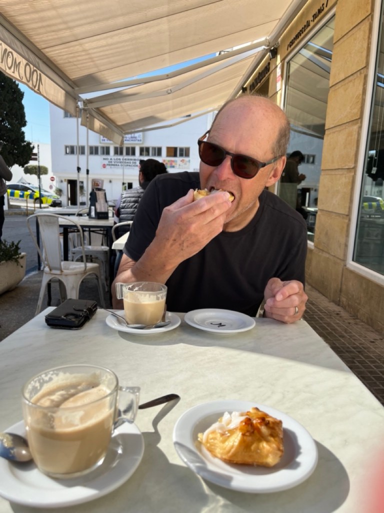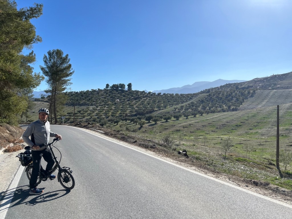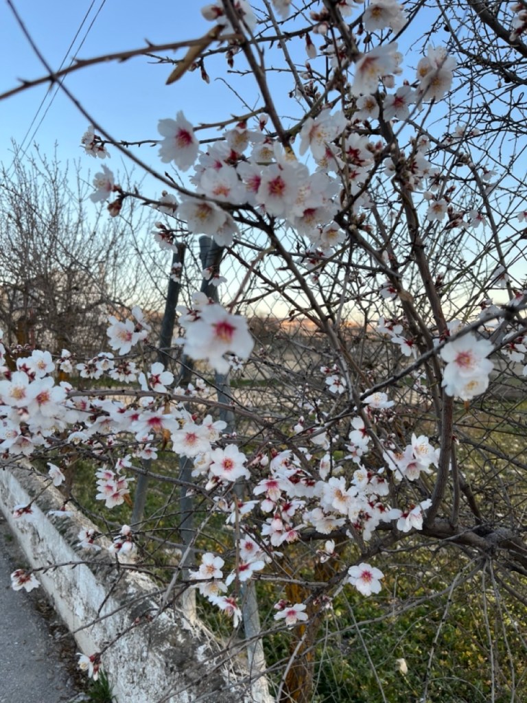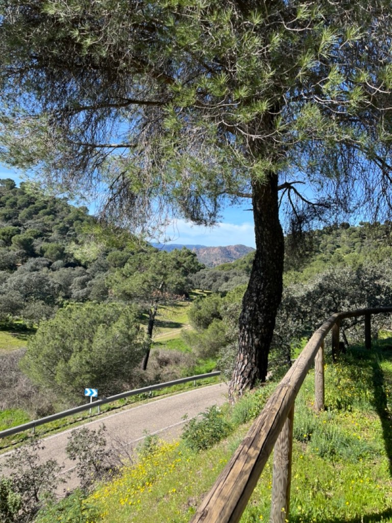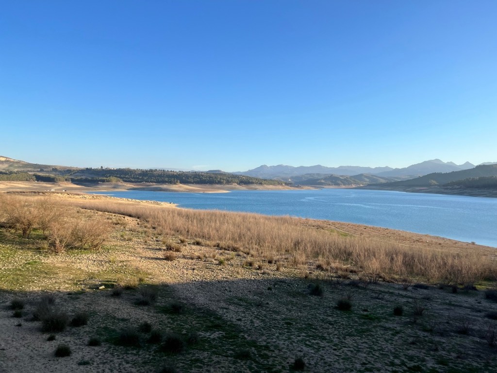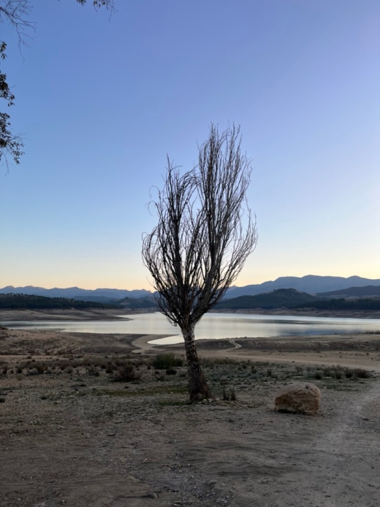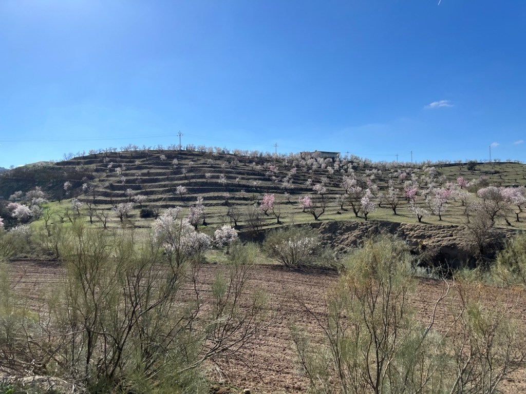 Efter många dagar med mycket människor och mycket husbilar på överfulla ställplatser fick vi nog och körde ut i ett naturreservat och var i princip själva på en ställplats vid en sjö på landsbygden. Den lilla orten heter Pantano de los Bermejales och här var det tyst och lugnt. Vi passade på att storstäda husbilen och tvätta. Sen tog vi cyklarna runt sjön och stannade till i de två små orterna Fornes och Arena del Rey. Efter lite letande hittade vi en öppen bykrog där vi käkade calameras och gambas till lunch. Det var faktiskt riktigt skönt med några ”tysta dagar”. Naturen är vacker här uppe och orten ligger inte långt från bergen Sierras de Tejeda. Längs vägen hit böljade terrasodlingar med olivträd men även mandelträd som börjat blomma. De är så vackra. När vi tog en kvällspromenad i lilla byn gick samtliga vakthundar igång. En började skälla ut oss och sen var det igång. Varje gårdshund skällde, och det fanns en vid varje hus, och det var ett himla väsen längs vår promenad 😂 De skötte i alla fall sitt jobb som vakthundar.