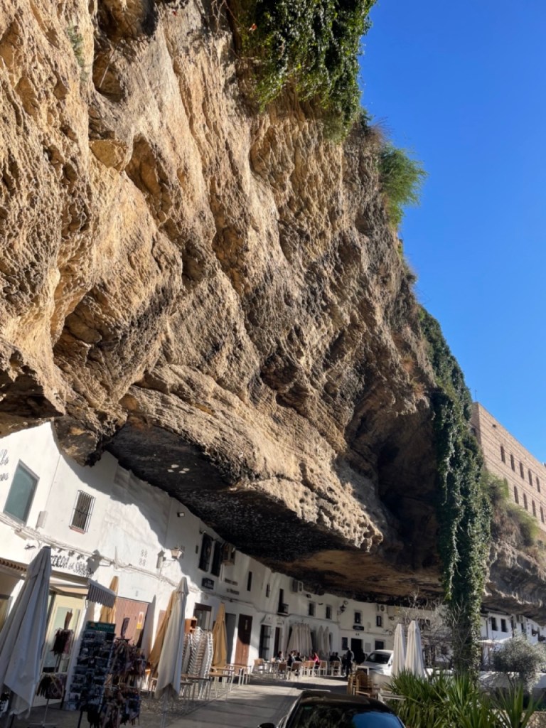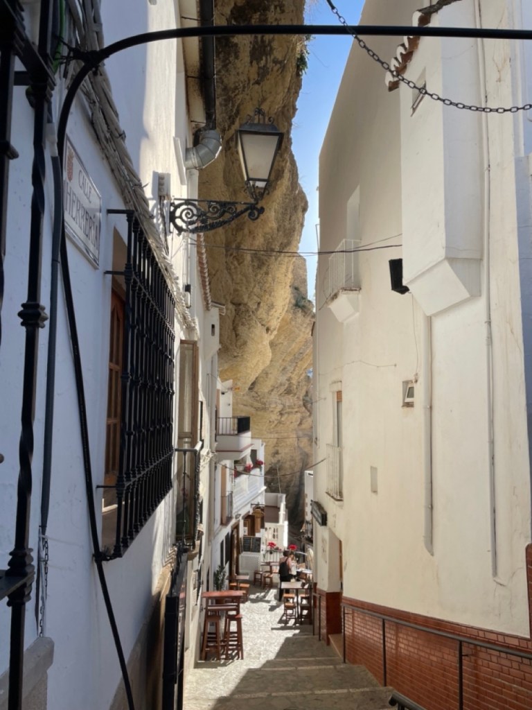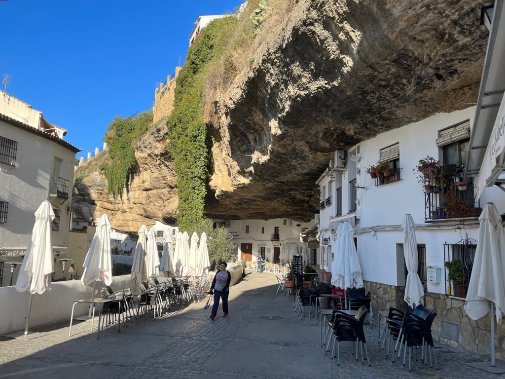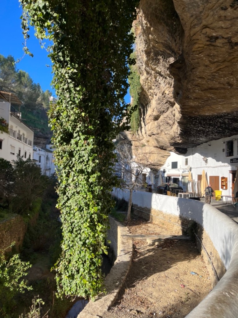 När vi var i Ronda tipsade våra grannar från Nederländerna om den lilla byn Setenil de las Bodegas. Den låg bara några mil norr om Ronda så dit styrde vi färden när vi käkat husbilsfrulle. Det fanns en stor grusparkering precis utanför byn där det stod flera husbilar och bussar. Perfekt läge för en liten kort promenad in i byn. Hela byn är så häftigt. Ligger i en bergsklyfta där flera av husen är byggda i och under bergen. Små smala charmiga gränder och många backar upp och ner. Vi gick upp till toppen där man kunde gå runt byn och titta ner. Häftigt!