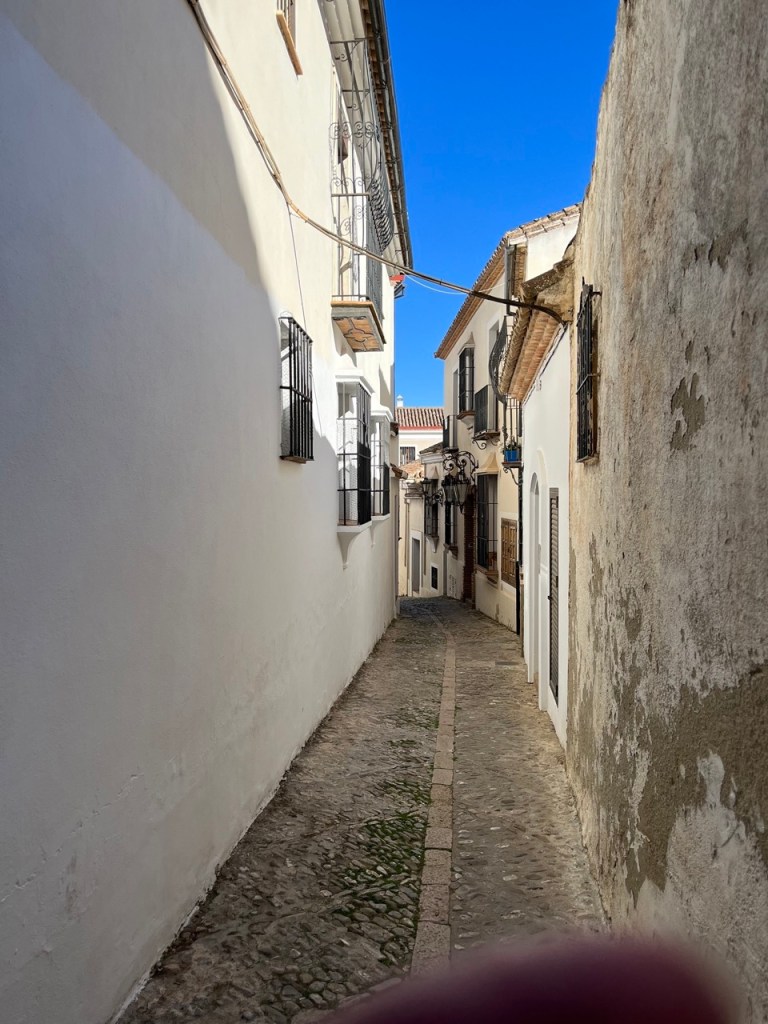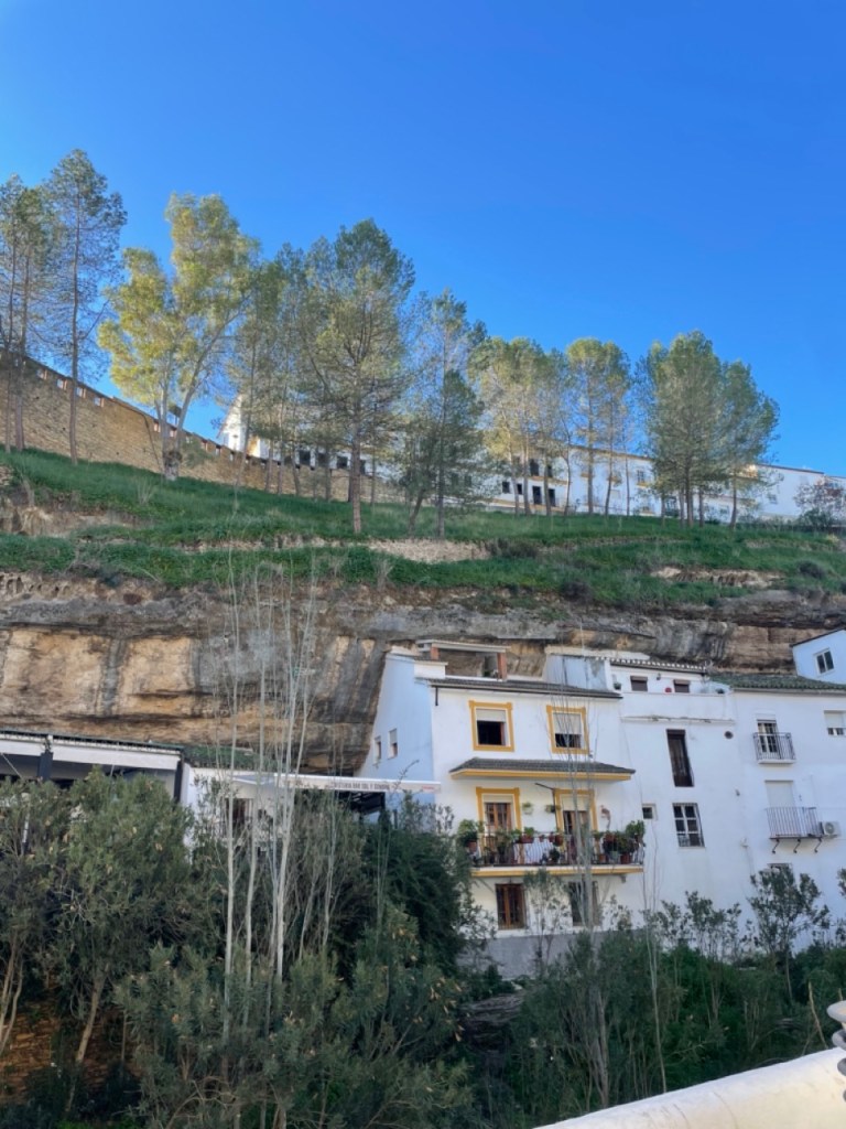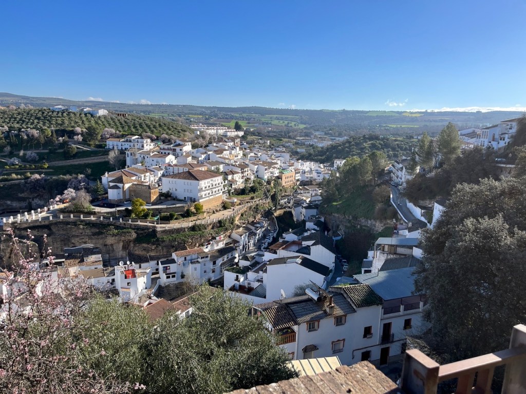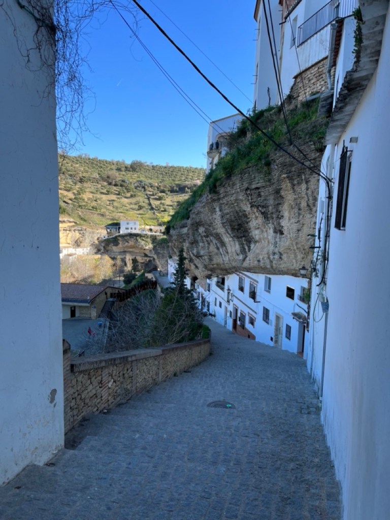 När vi var i Ronda tipsade våra grannar från Nederländerna om den lilla byn Setenil de las Bodegas. Den låg bara några mil norr om Ronda så dit styrde vi färden när vi käkat husbilsfrulle. Det fanns en stor grusparkering precis utanför byn där det stod flera husbilar och bussar. Perfekt läge för en liten kort promenad in i byn. Hela byn är så häftigt. Ligger i en bergsklyfta där flera av husen är byggda i och under bergen. Små smala charmiga gränder och många backar upp och ner. Vi gick upp till toppen där man kunde gå runt byn och titta ner. Häftigt!