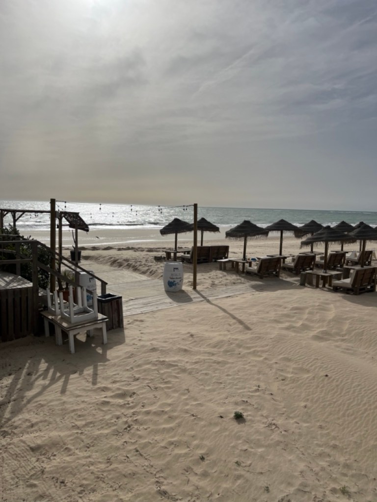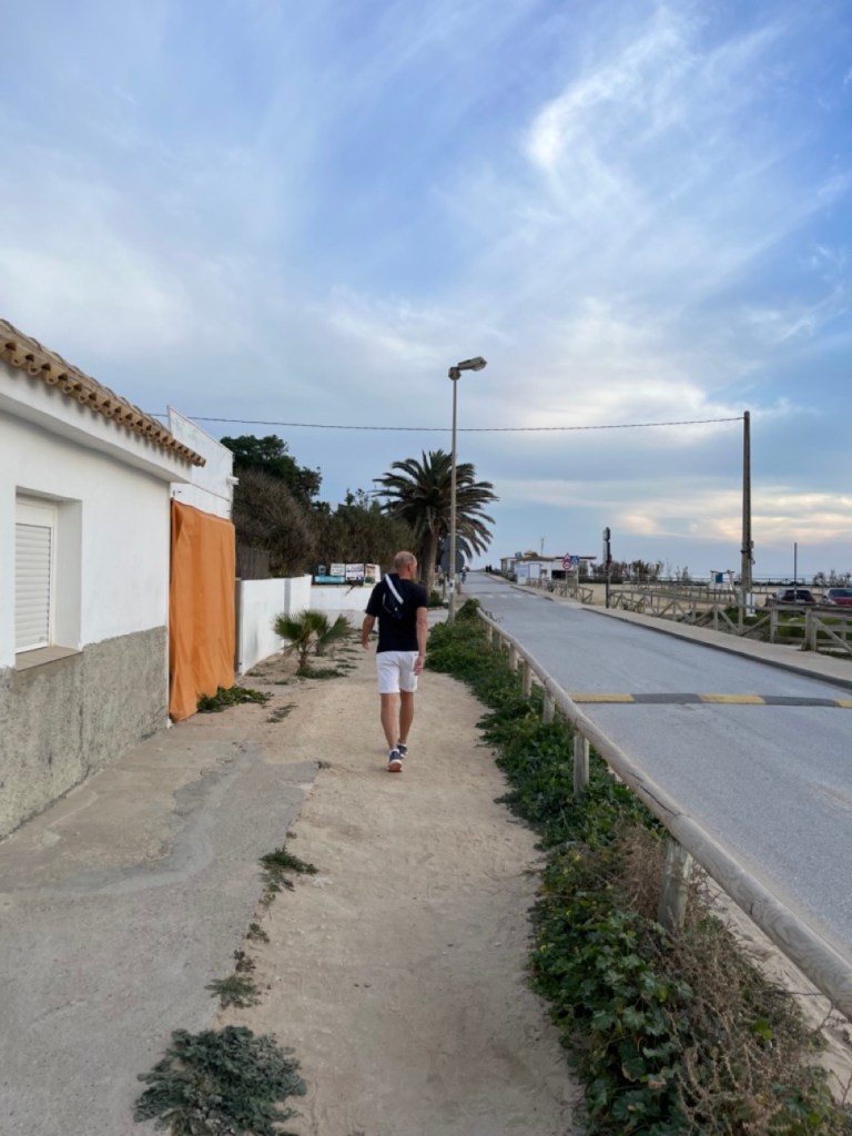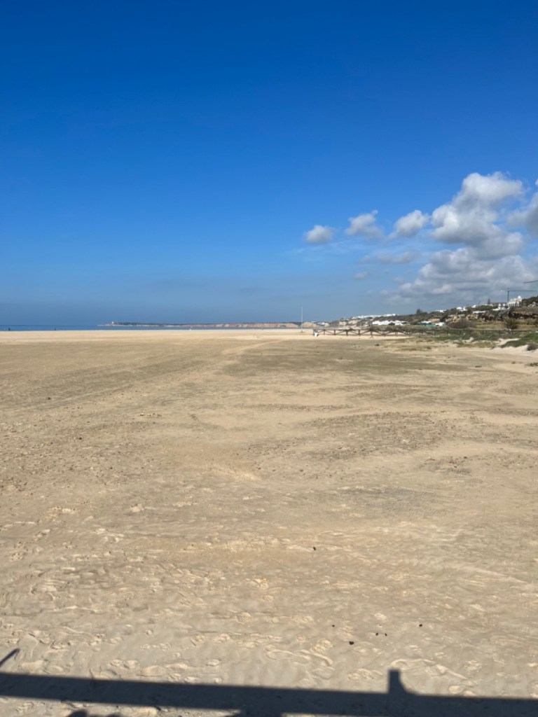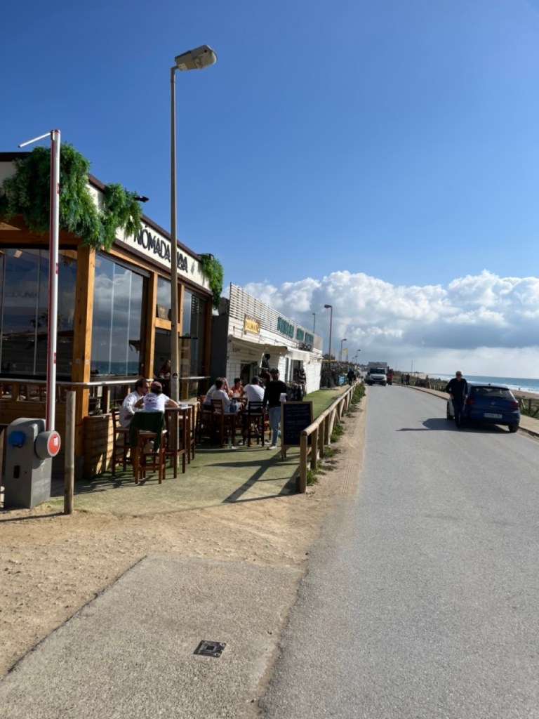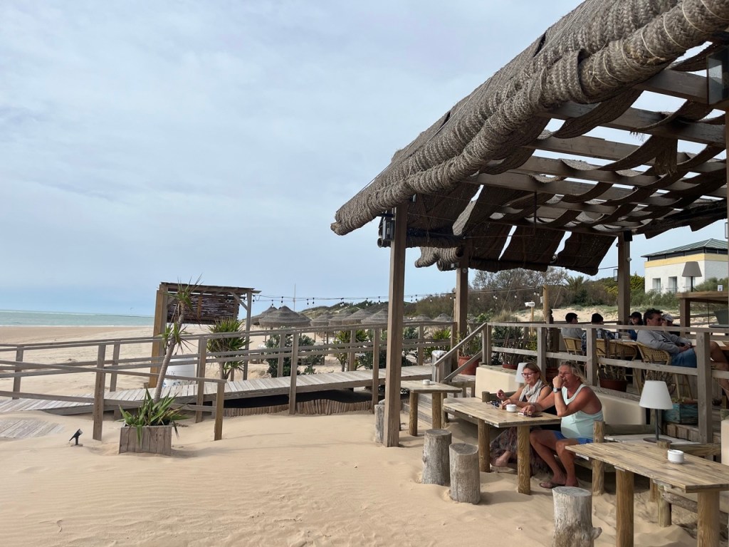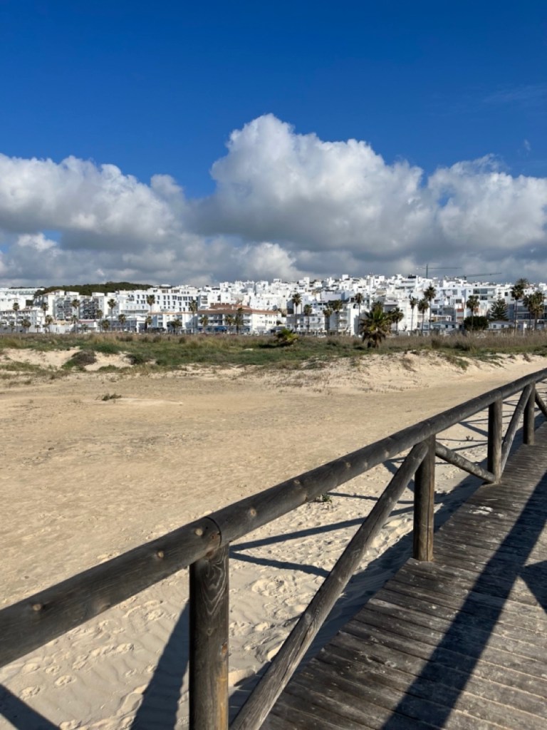 Nästa stopp blev El Palmar de Vejer. Vi kollade på kartan och tyckte det verkade bra. Bokade ställplats och blev glatt överraskade av den charmiga lilla surfinghålan. Trots 15 grader i vattnet var det massor av surfare som kämpade i vågorna. Förvisso med våtdräkter. Längs den flera kilometer långa strandvägen ligger det massor av coola surfhak och vi insåg att vi för första gången på resan tillhörde det äldre gardet i byn. Många hemmasnickrade husbilar och campervans med surfbrädor på taket. Det märktes också på menyerna – inga tapas, men massor av hummus, poké bowls och annat gott. Det har vi längtat efter. Grannbyn, ca 7 km västerut heter Conil de la Frontera och ligger som en stor vit fläck i horisonten när man kollar från El Palmar. Vi blev så klart nyfikna och cyklade dit. En jättemysig liten stad med en fantastisk lång och bred sandstrand. Det är kul att upptäcka sådana här små guldkorn som vi tidigare aldrig hört talas om. Vi är nu vid Atlantkusten och har lämnat Medelhavet bakom oss på denna resa.