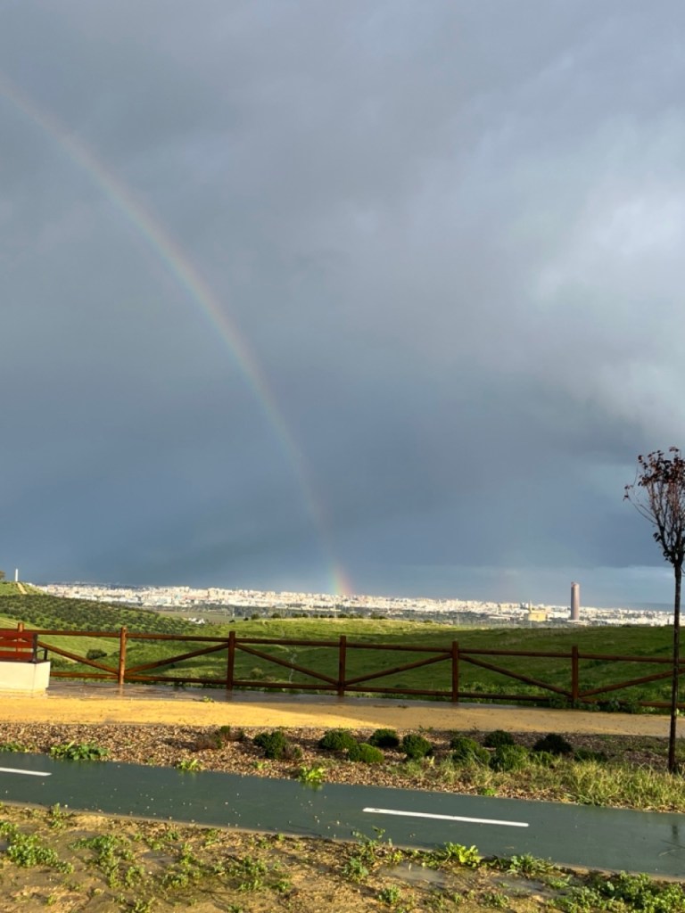 Vi har hittat en mysig ställplats norr om Sevilla i en liten by som heter Guzman. Byn har magisk utsikt över Sevilla och första dagen bjöd på åskväder och vacker regnbåge som landade mitt i staden.