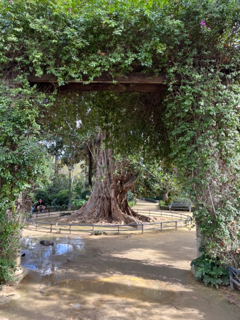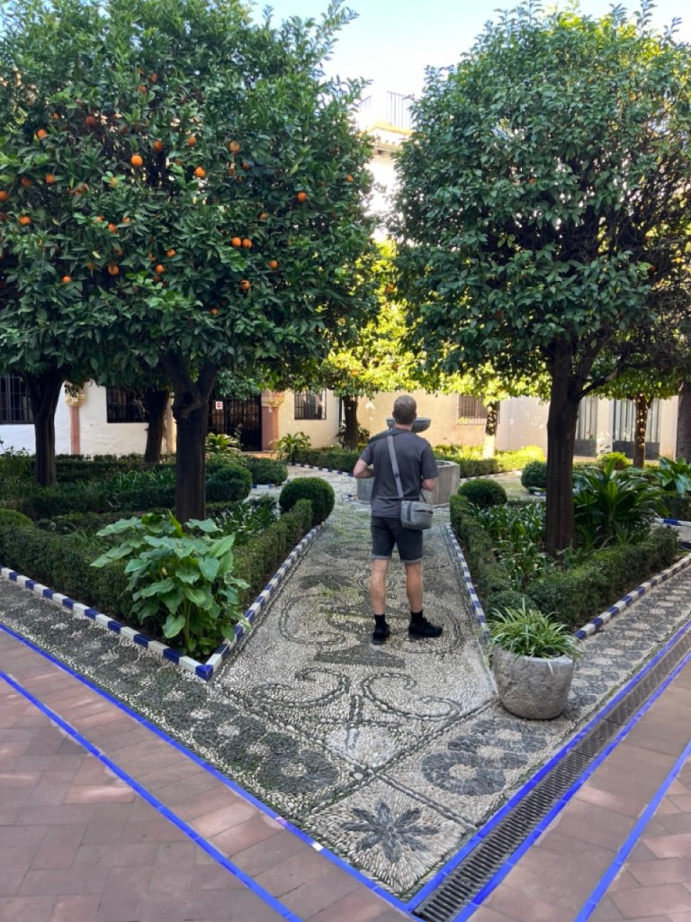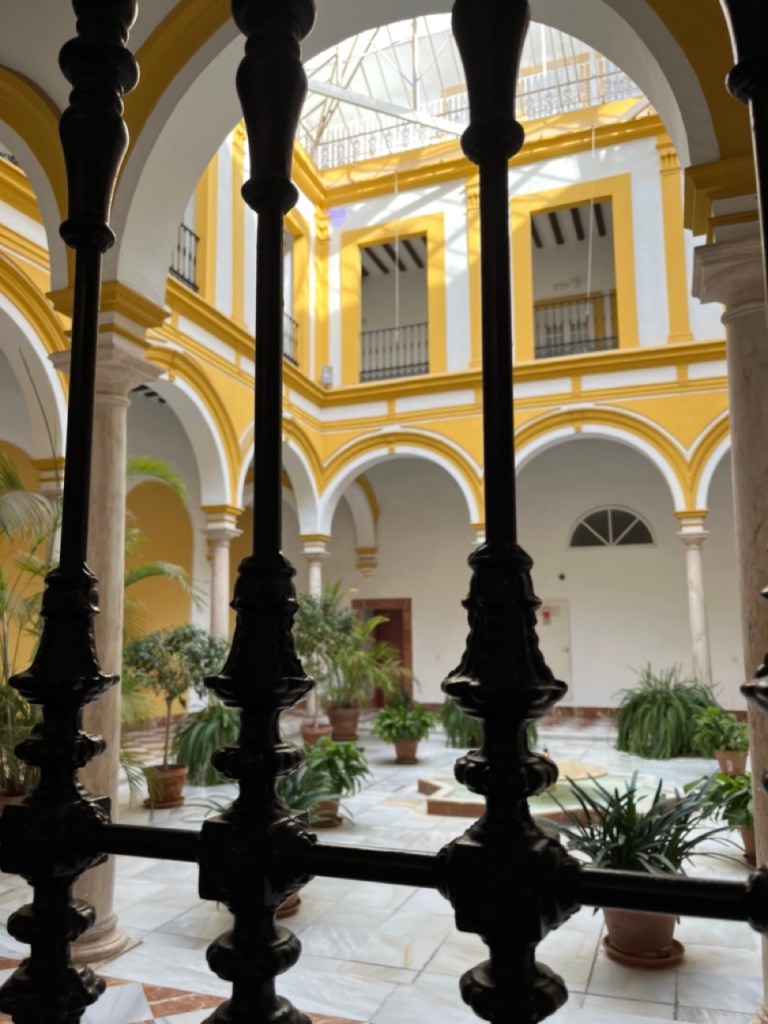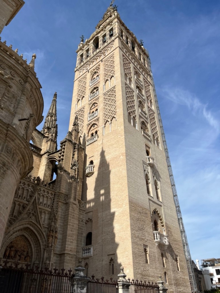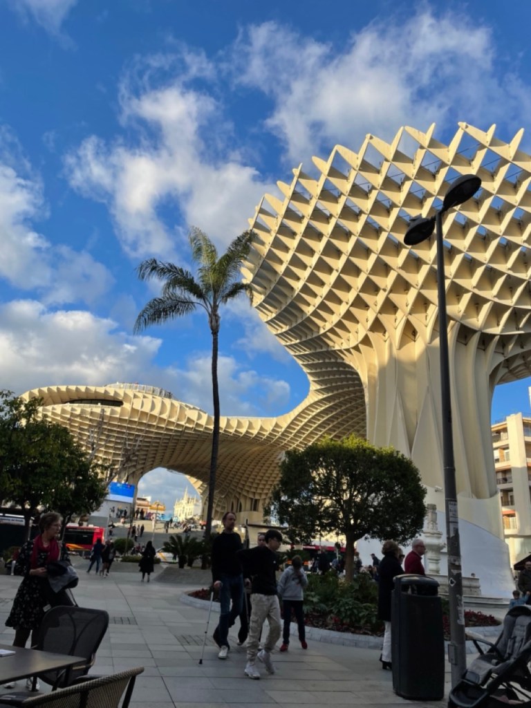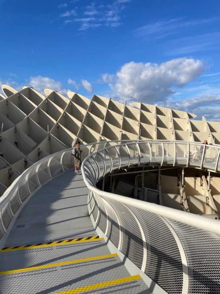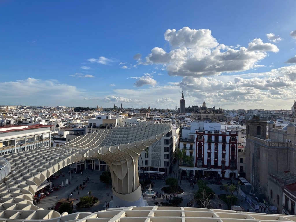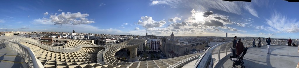 På väg tillbaka mot katedralen gör vi ett nytt försök med Alcázar och inser att det ligger typ granne med katedralen 😂, lite känsla av Peppes Bodega blev det. Ja, ja… vi hittade i alla fall till slut. Biljetterna var slutsålda så det blev endast en okulär besiktning även här. En sak som jag hade på listan i Sevilla var det häftiga utsiktstornet Setas de Sevilla. Dit löste vi biljetter och fick börja med en filmvisning på en 180 grader LED-skärm. Häftigt med vyer över stan och ett inslag av flamenco. Sen var det bara att vandra runt i tornet och beskåda Sevilla från alla väderstreck. Imponerande vyer och ett häftigt bygge.