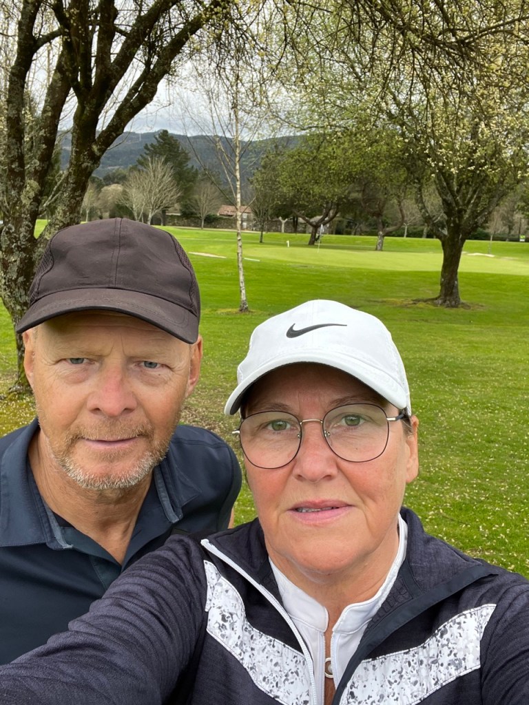 Dag 2 – premiär att cykla med golfbag. Det gick fint trots några rejäla uppförsbackar. Högsta batteriläget i och vi kom hela vägen upp till klubbhuset. Banan var i hyfsat fint skick. Pga mycket regn hade de inte klippt på ett tag så det blev några förlorade bollar i ruffen. Men fina greener ⛳️ och idag var det vinst till mig. Staffan skyllde på dåligt klippt ruff och då undrade jag varför han skulle vara där istället för på fairway 😂. Klipptåget gick efter oss så med facit i hand skulle vi bokat en timme senare 🙂